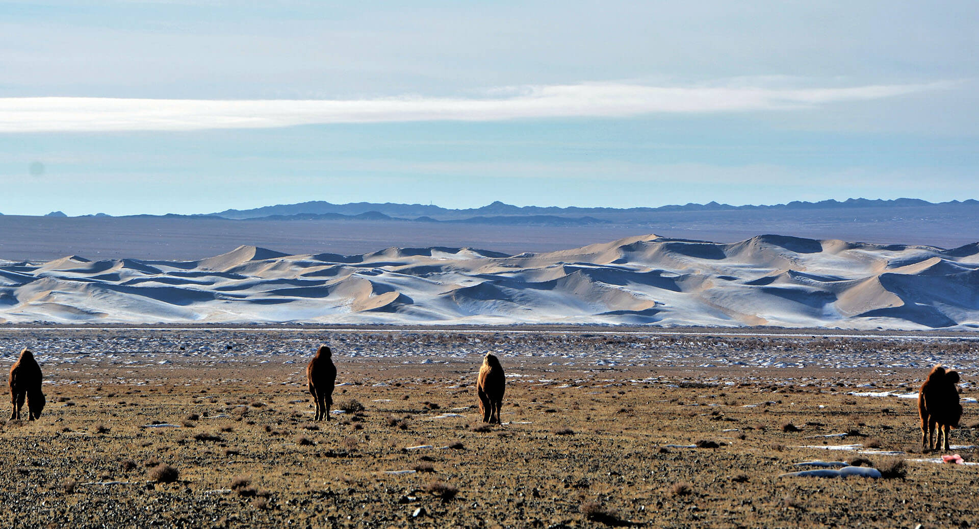 The south Mongolia is Gobi just as you’d expect. It’s big, empty and combination of different landscape. The south Mongolia’s magnificent scenery is the stuff dreams are made of and the reason it’s easily distinguishable zones such as open expanses of steppe, sweeping forms of large dunes, wetland created by the spring-fed and dark, jagged of mountain ranges. There is Gurvan Saikhan National park in the south Mongolia protecting a rich natural, cultural and scientific heritage, its landscapes, belonging to the desert steppe and desert zones, are of great diversity and host a variety of ecosystems including oasis, salt marshes, dunes, mountain steppe, alpine meadows, lakes and wetlands. In the park’s eastern region, the rugged mountain ranges of the “Three Beauties” (2825m) rise steeply from the steppe pastures. In the eastern mountain, “Vulture Gorge” is a the most visited attraction; in the deep and narrow gorge the creek usually remains frozen year-round as its ice builds up to several meters thickness throughout the winter.